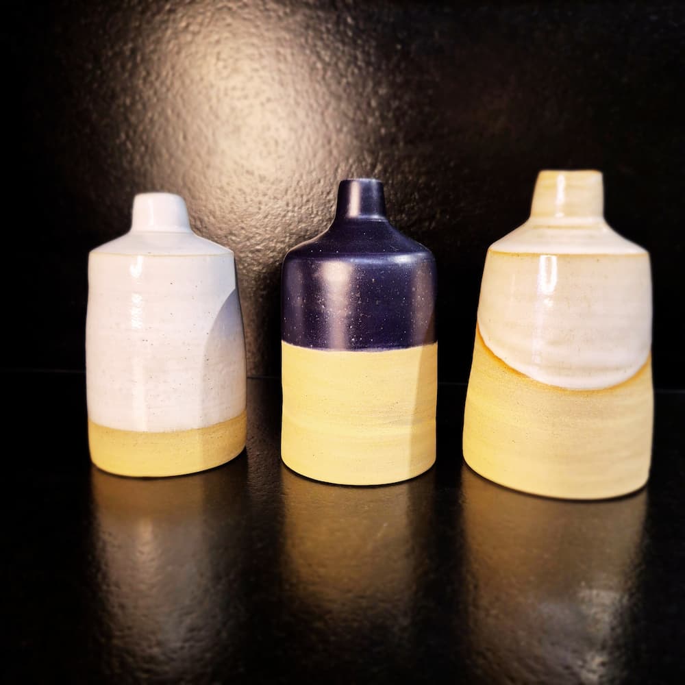 Grès noir de Saint Amand tourné et émaillé, blanc brillant, bleu nuit. Double cuisson.